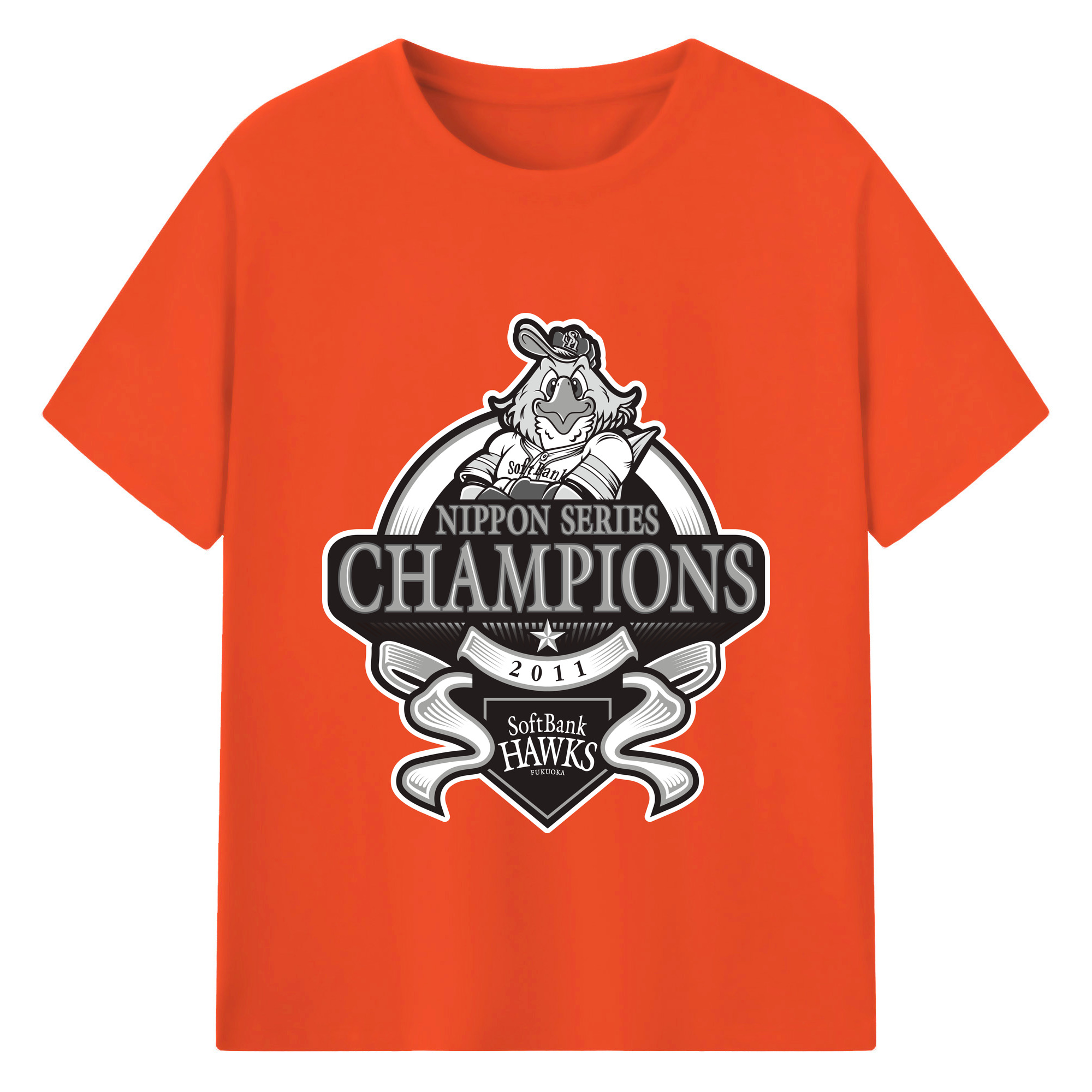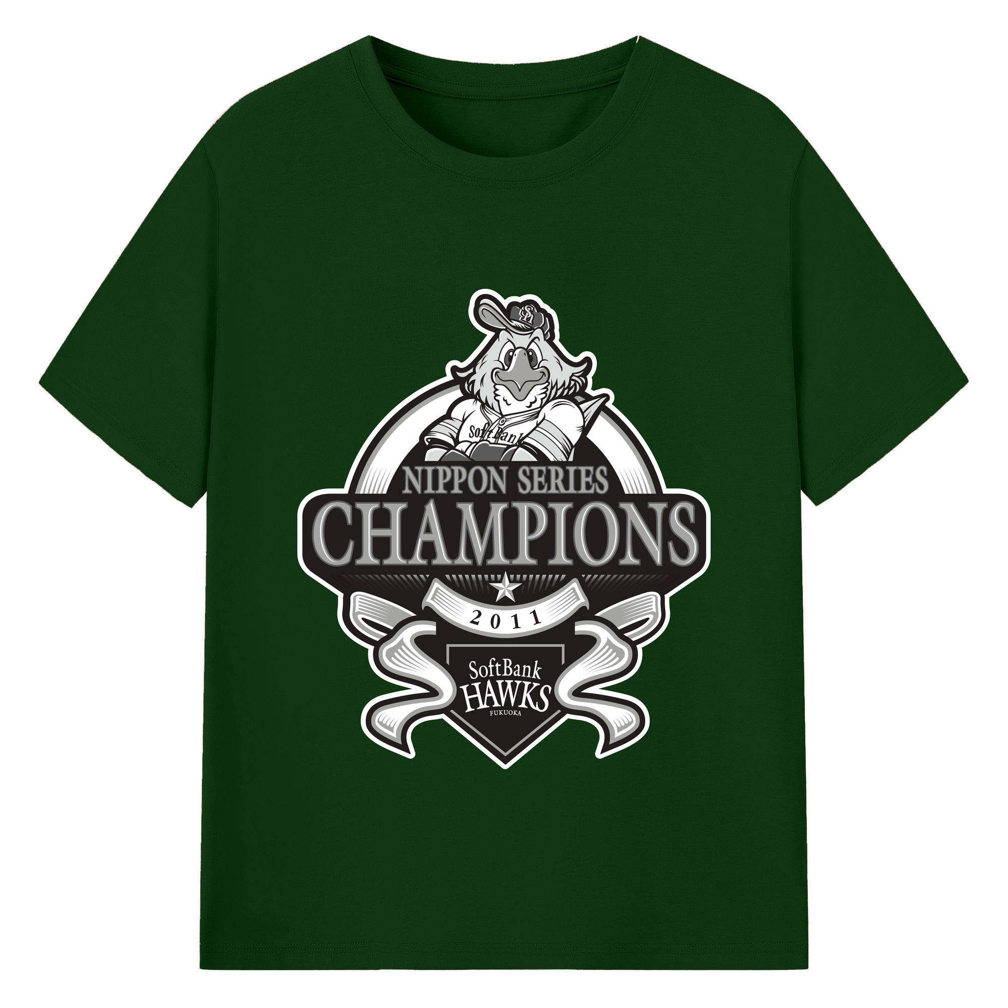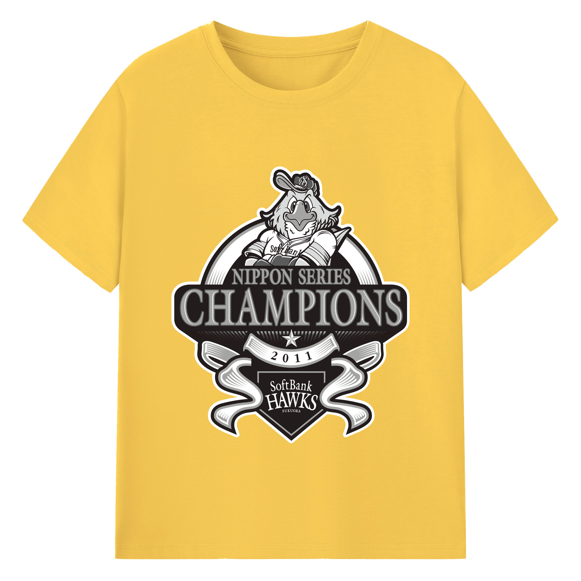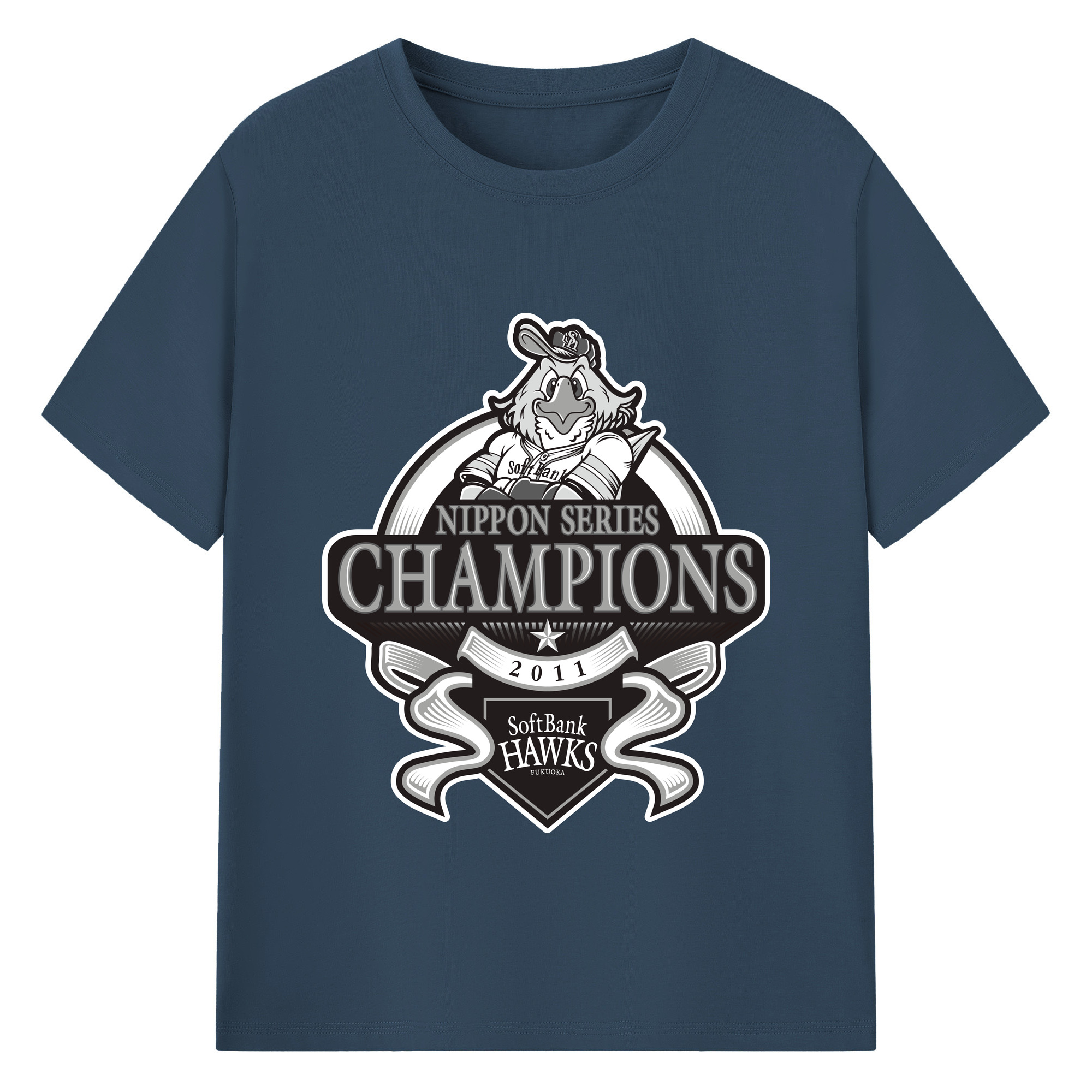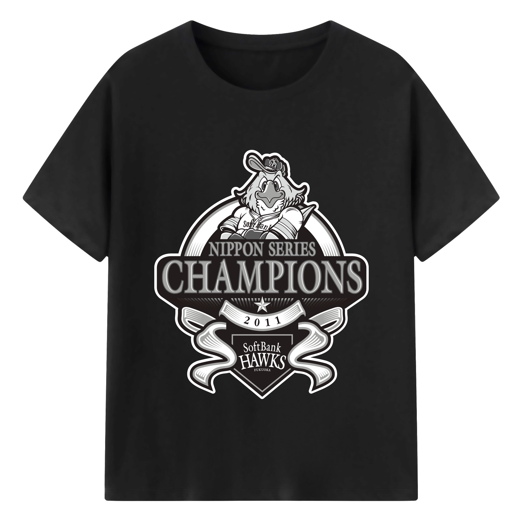 FUKUOKA SOFTBANK HAWKS 2011 NIPPON CHAMPIONS Black Logo - 綿100% 半袖Tシャツ ・ バックプリント ・ 快適 通気性 ・ 日常使い 散歩 スポーツ用